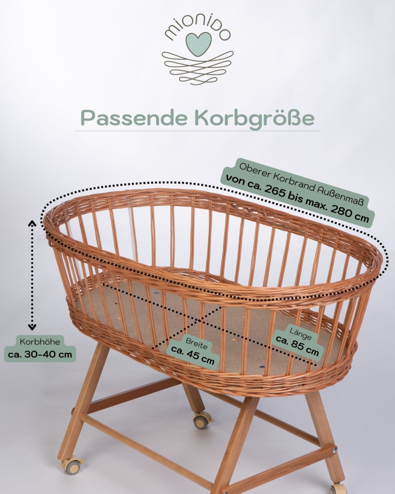 • Polster: Unsere Polster eigenen sich für eine Körbhöhe von ca. 30-40 cm, mit Korbboden ca. 85x45 cm und Umfang des oberen Korbrandes von ca. 265 - max. 280 cm (Passende Korbmaße auf Bildern abgebildet).