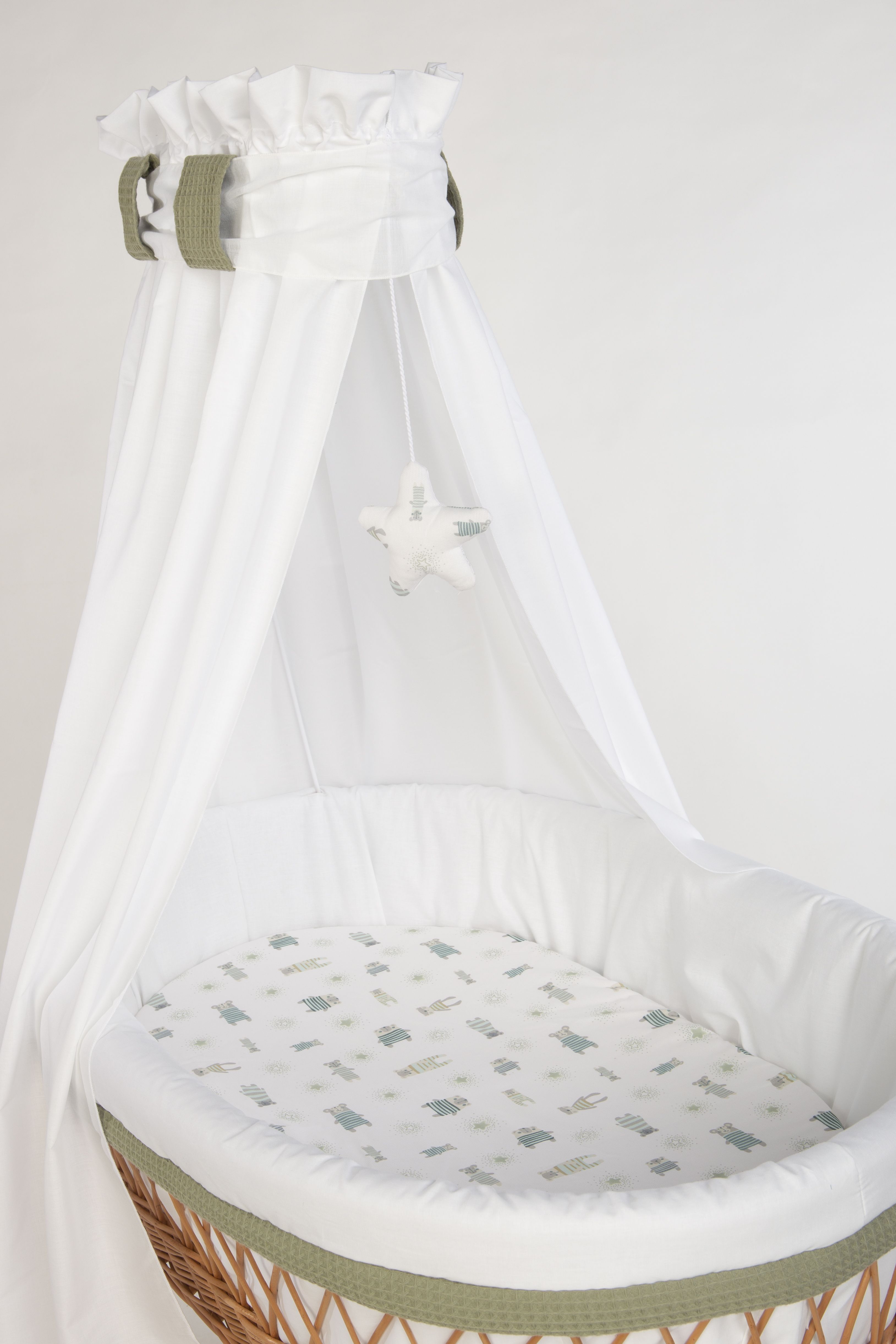 Dieses besondere textile Set eignet sich hervorragend für Ihren Stubenwagen und ist genau auf die Bedürfnisse eines Säuglings abgestimmt. Die weiche Baumwolle bietet einen kuscheligen Schlafplatz für Ihr Baby und schützt es gleichzeitig durch die weiche Wattierung des Polsters. Der im Set enthaltene Himmel sorgt durch den luftig fließenden Stoff für gedämpftes Licht und eine ruhige und wohlige Schlafatmosphäre, die besonders für ein Neugeborenes sehr wichtig ist. Das dazugehörige Mobile rundet das Gesamtbild Ihres Stubenwagens dekorativ ab. Da mit zunehmendem Alter die Wahrnehmung und das Interesse Ihres Babys für die Umgebung steigt, besteht auch die Möglichkeit den Himmel abzunehmen. Dieses komplette textile Set ist die ideale Ausstattung für Ihren Stubenwagen. Ein harmonisches Design, kombiniert mit dem Fokus auf die richtige und liebevolle Schlafumgebung Ihres Babys im Stubenwagen.