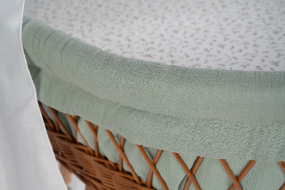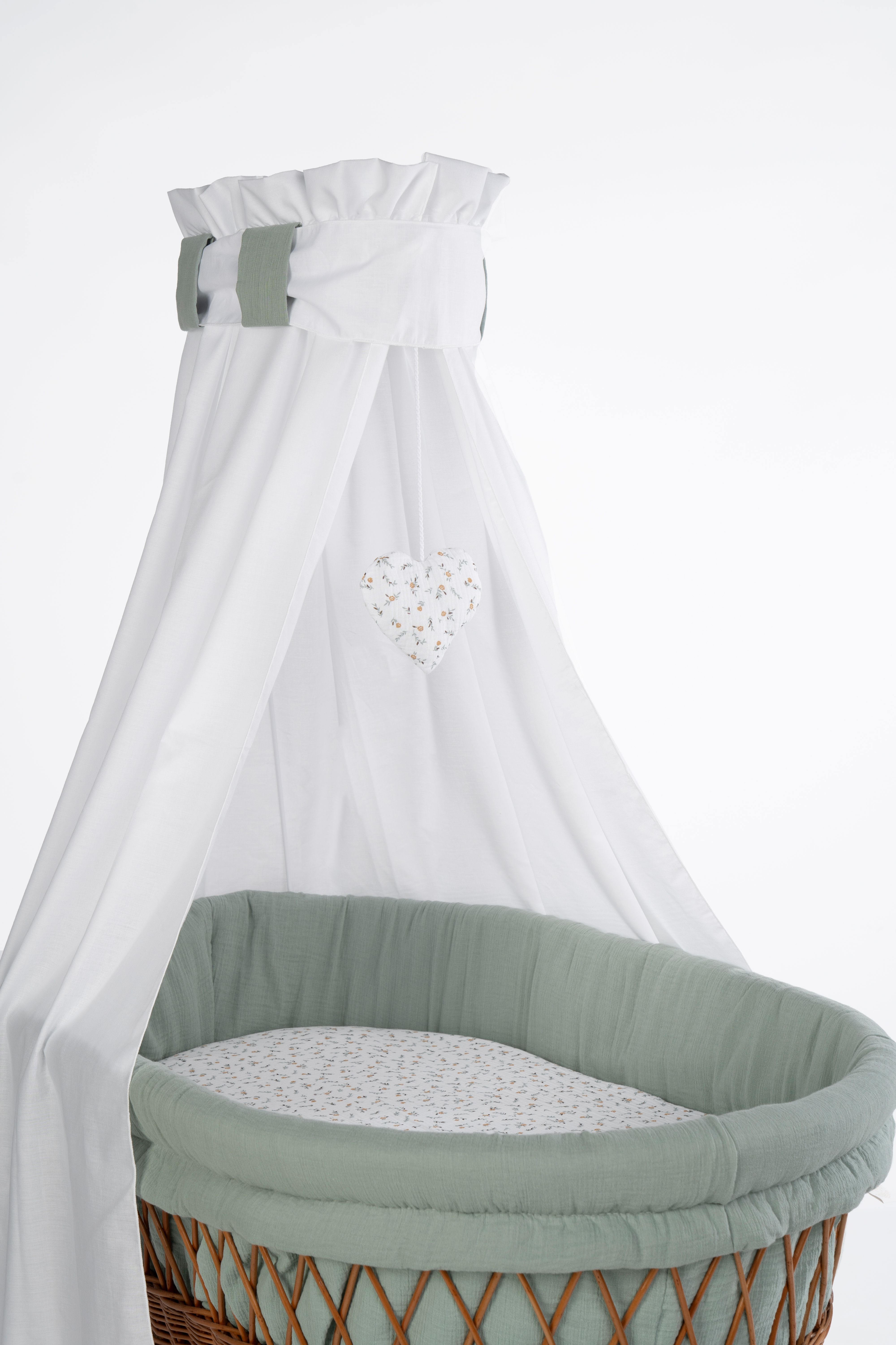 Die Kombination mit dem vollständigen textilen Set aus weicher Bio-Baumwolle schafft ein harmonisches Design. Der fließende Stoff des Himmels sorgt für gedämpftes Licht und eine ruhige Schlafatmosphäre, die Wattierung des Polsters schützt vor dem Anstoßen. Das Set ist somit genau auf die Bedürfnisse des Säuglings abgestimmt und wird komplett in unserer Manufaktur in Deutschland entworfen und gefertigt.
