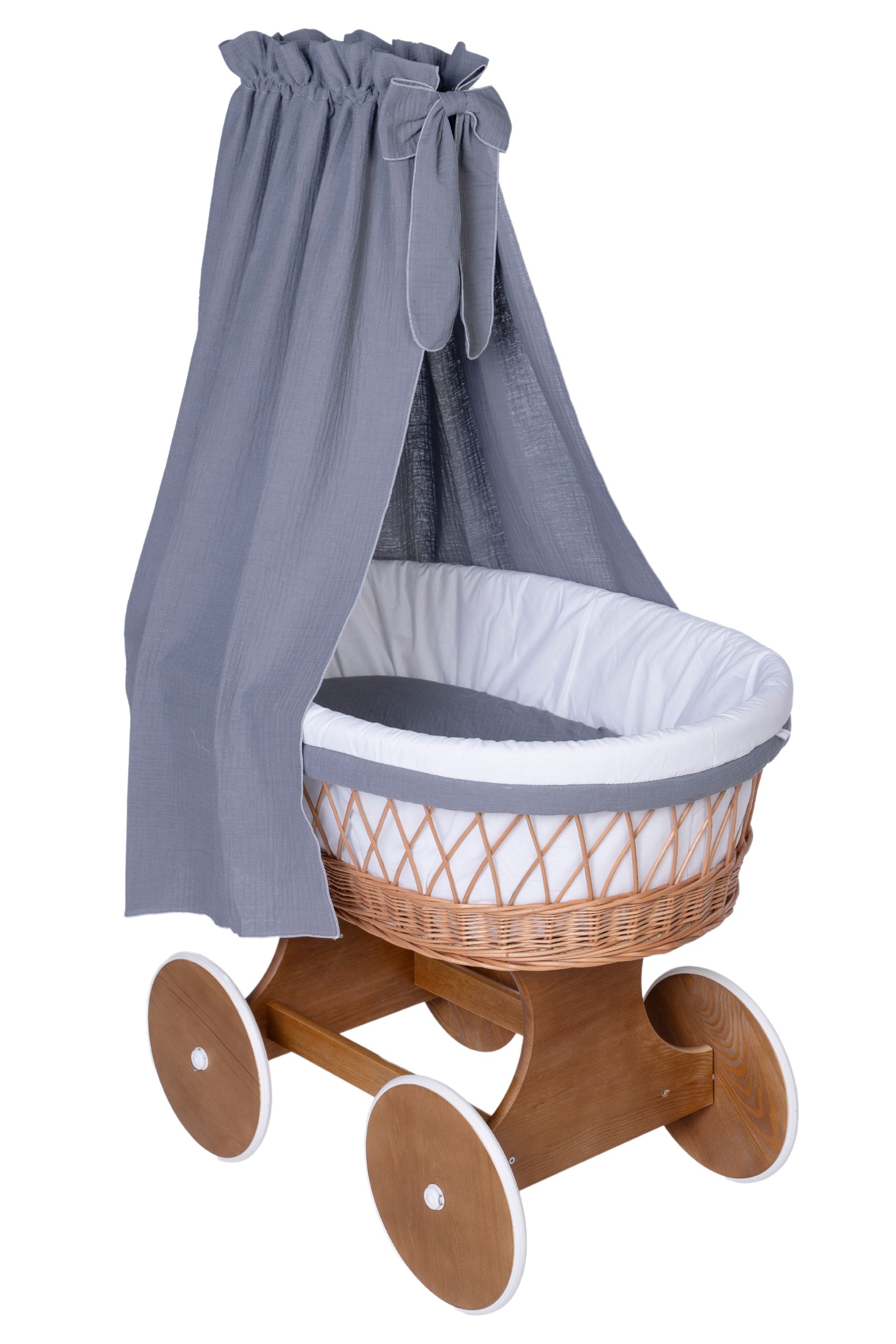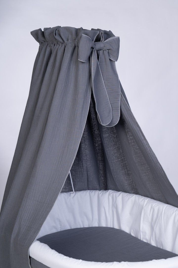 Das vollständige textile Set schafft durch die Kombination aus weicher Bio-Baumwolle und hochwertigem Musselin ein harmonisches Design. Der fließende Stoff des Himmels sorgt für gedämpftes Licht und eine ruhige Schlafatmosphäre, die Wattierung des Polsters schützt vor dem Anstoßen. Das Set ist somit genau auf die Bedürfnisse des Säuglings abgestimmt und wird komplett in unserer Manufaktur in Deutschland entworfen und gefertigt.