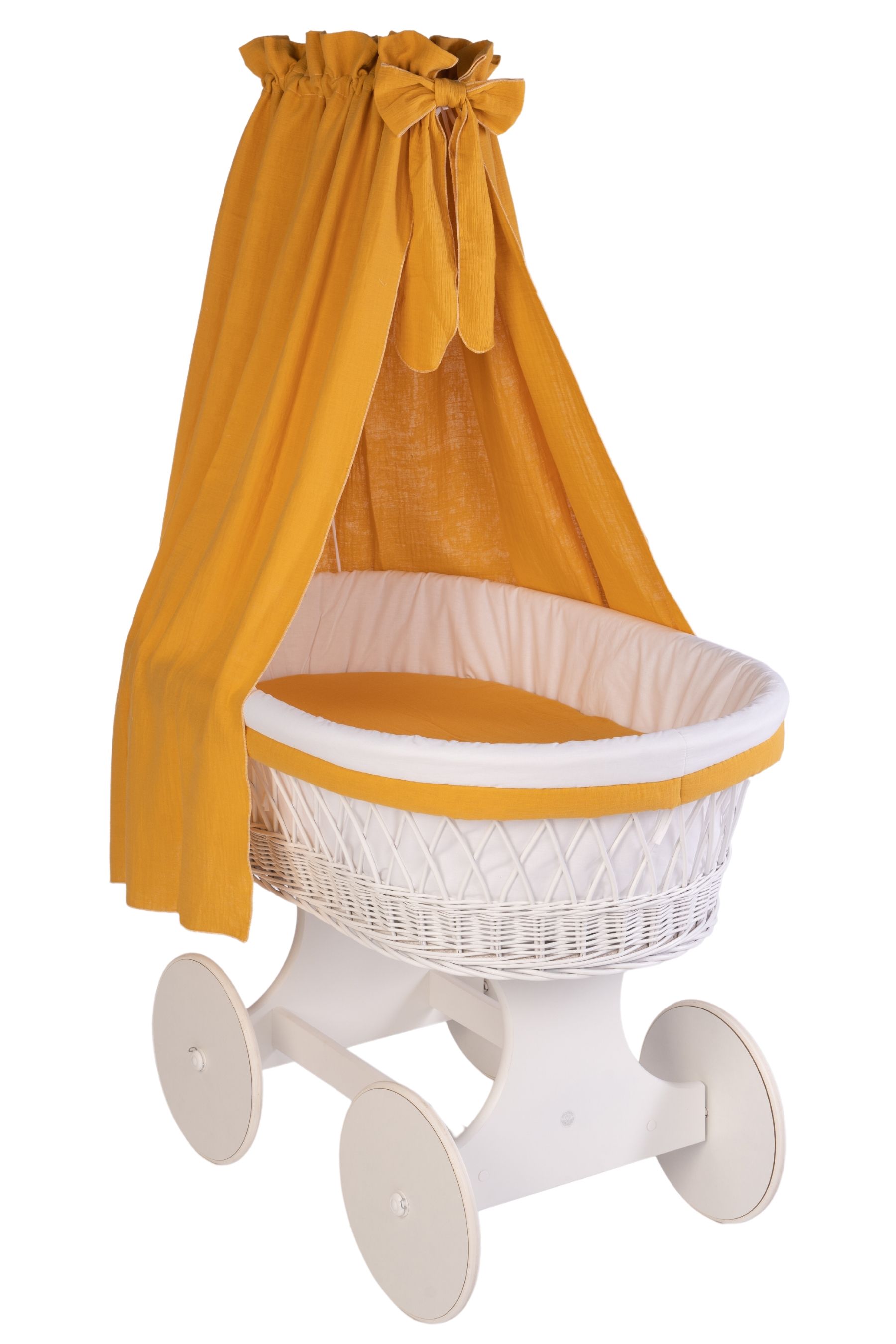 Das vollständige textile Set schafft durch die Kombination aus weicher Bio-Baumwolle und hochwertigem Musselin ein harmonisches Design. Der fließende Stoff des Himmels sorgt für gedämpftes Licht und eine ruhige Schlafatmosphäre, die Wattierung des Polsters schützt vor dem Anstoßen. Das Set ist somit genau auf die Bedürfnisse des Säuglings abgestimmt und wird komplett in unserer Manufaktur in Deutschland entworfen und gefertigt.