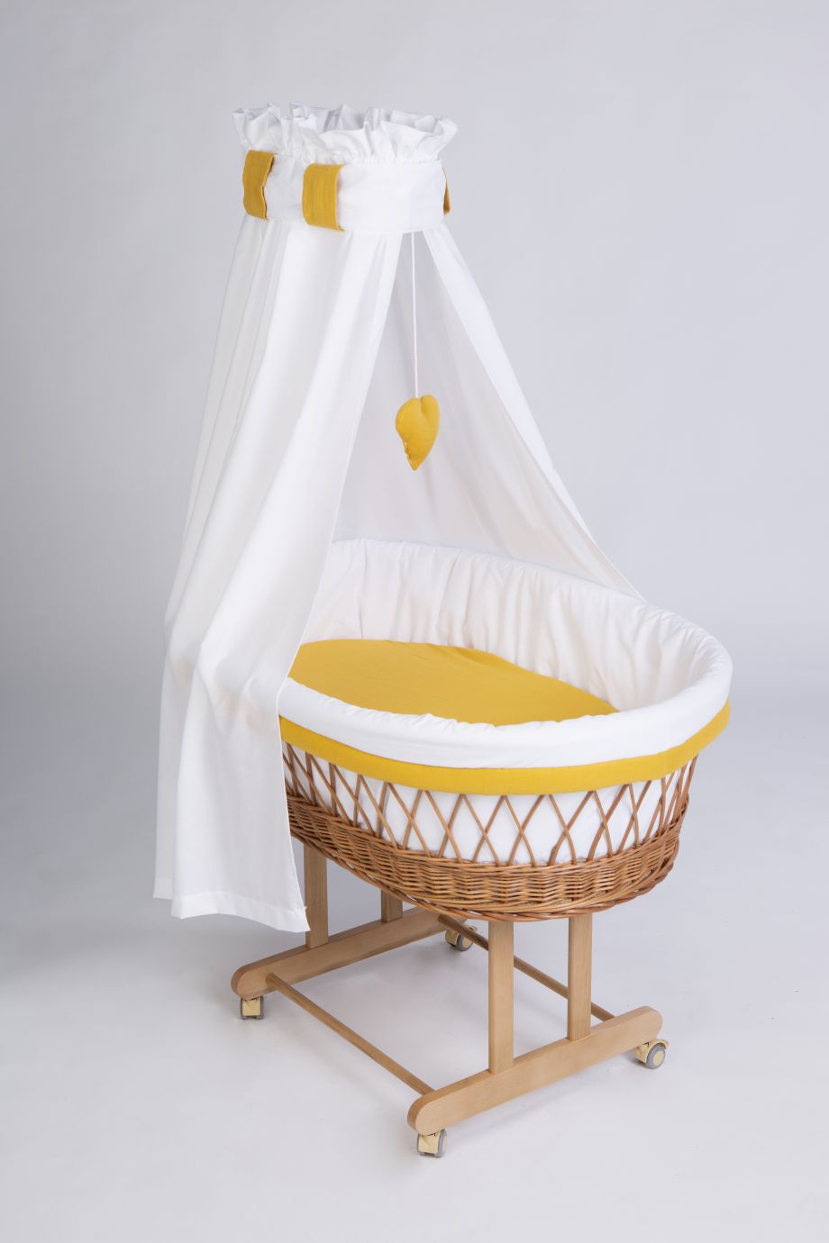 Die Kombination mit dem vollständigen textilen Set aus weicher Bio-Baumwolle schafft ein harmonisches Design. Der fließende Stoff des Himmels sorgt für gedämpftes Licht und eine ruhige Schlafatmosphäre, die Wattierung des Polsters schützt vor dem Anstoßen. Das Set ist somit genau auf die Bedürfnisse des Säuglings abgestimmt und wird komplett in unserer Manufaktur in Deutschland entworfen und gefertigt.